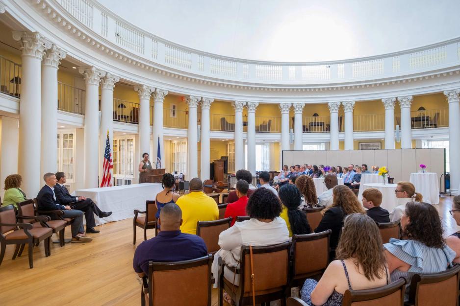 President Ryan announces the first winners of the "Hoos Making an Impact" program, which solicits and implements innovative ideas from staff across Grounds. The inaugural theme was sustainability with the winners proposing plans to reduce paper waste and encourage alternative commuting models.